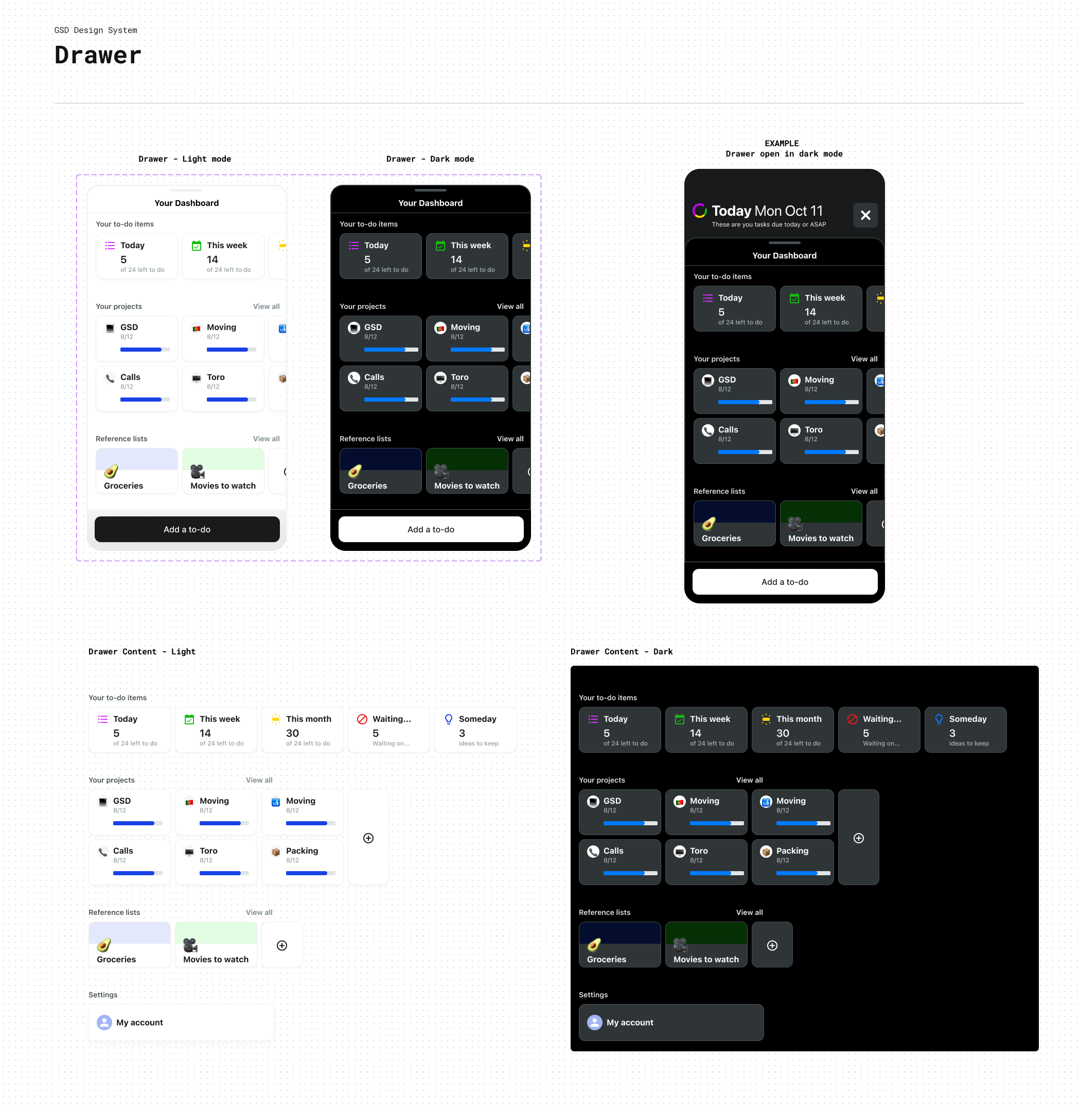 Navigation, drawer, and modal patterns were designed to support quick capture, project switching, and focused task editing without leaving the main flow.